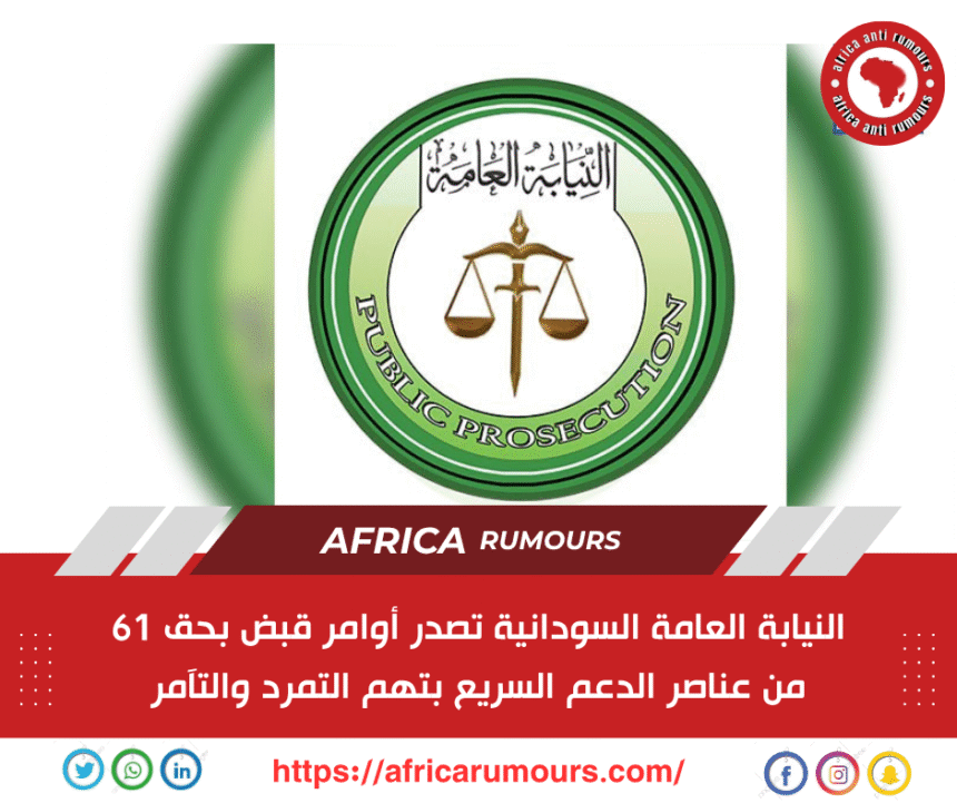 افريقيا ـ السودان أصدرت النيابة العامة السودانية، ممثلة في وكيل النيابة الأعلى بنيابة الكلاكلة – قطاع الخرطوم جنوب، أوامر قبض بحق 61 من منسوبي قوات الدعم السريع، على خلفية اتهامهم بالضلوع في أعمال تمرد مسلح وتآمر ضد الدولة. وأوضحت النيابة، في بيان رسمي، أن القضية قُيّدت تحت الرقم (3746) للعام 2025، وتستند إلى المواد (26، 50، 51) من القانون الجنائي…