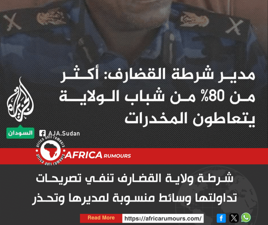 افريقيا ـ السودان نفت شرطة ولاية القضارف ما جرى تداوله على بعض منصات التواصل الاجتماعي بشأن تصريح منسوب للسيد مدير شرطة الولاية، يُزعم فيه أن 80% من شباب الولاية يتعاطون…