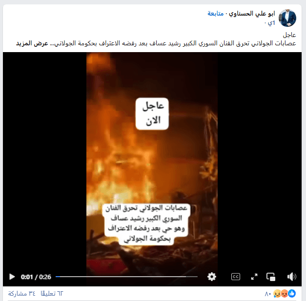 مقطع فيديو نشرته حسابات وصفحات على مواقع التواصل الاجتماعي، حديثًا، ادعت أنه لقيام عناصر تابعة لقوات الأمن السورية بحرق الفنان السوري رشيد عساف بعد رفضه الاعتراف بحكومة الرئيس أحمد الشرع.