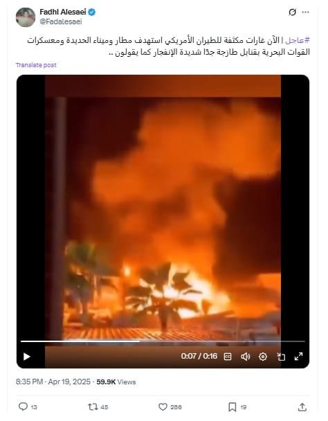 فيديو متداول حديثًا، ادّعى ناشروه أنه يُظهر غارات جوية مكثفة نفّذها الطيران الأميركي، استهدفت مطار وميناء الحديدة ومعسكرات تابعة للقوات البحرية، بقنابل شديدة الانفجار، مساء أمس 19 إبريل/نيسان.
