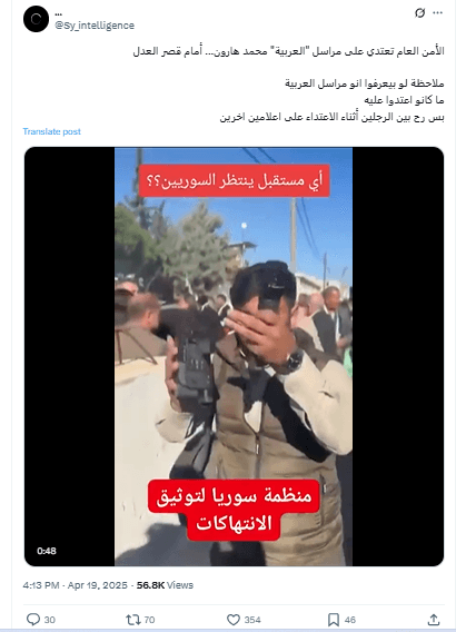 مقطع فيديو تتداوله حسابات وصفحات على مواقع التواصل الاجتماعي، حديثًا، ادعى ناشروه أنه يوثّق اعتداء الأمن العام السوري على مراسل العربية محمد هارون أمام قصر العدل.