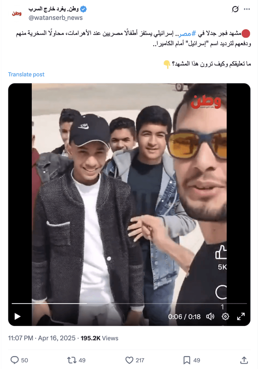 فيديو تتداوله وسائل إعلام وحسابات وصفحات على مواقع التواصل الاجتماعي، ادّعت أنه لسائح إسرائيلي دخل مصر حديثًا وحاول استفزاز المصريين من أمام الأهرامات.