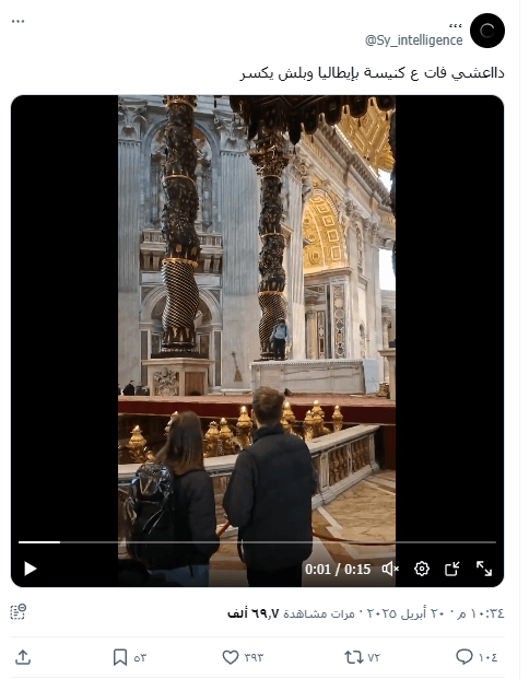 مقطع فيديو نشرته حسابات وصفحات على مواقع التواصل الاجتماعي، حديثًا، ادعى ناشروه أنه يُظهر عنصرًا من تنظيم الدولة الإسلامية (داعش) يعتدي على كنيسة في إيطاليا ويُحطّم محتوياتها.