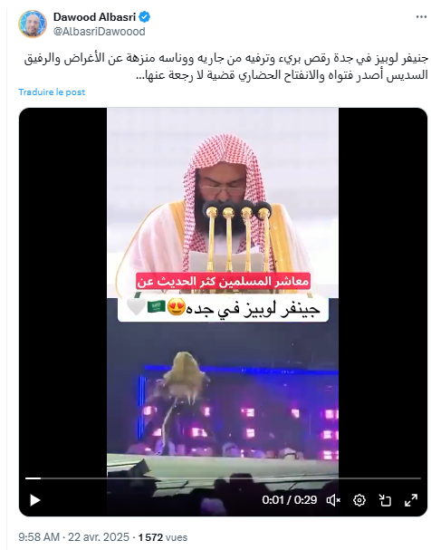 مقطع فيديو نشرته حسابات على مواقع التواصل الاجتماعي، حديثًا، ادعى ناشروه أنه لحديث الشيخ عبد الرحمن السديس عن حفلات الترفيه عقب عرض جينيفر لوبيز الأخير في جدة، وجاء فيه “معاشر المسلمين كثر الحديث عن حفلات الترفيه ومشاهد الرقص وينبغي أن نعلم أنها أنشطة ترفيهية ولا يعيب المسلم أن يترفه بعد الصلاة والصيام والحج، فالترفيه ليس محرمًا ولا ممنوعًا فلا تلتفتوا إلى دعاة الفتنة الذين يحرمون ما أحله الله لعباده”.