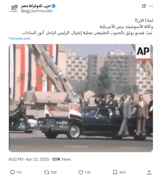 مقطع فيديو تتداوله حسابات وصفحات على مواقع التواصل الاجتماعي، حديثًا، ادّعت أنه نُشر للمرة الأولى مؤخرًا عبر وكالة أسوشييتد برس الأميركية، ويُوثّق بالصوت الطبيعي لحظة اغتيال الرئيس المصري الأسبق، أنور السادات، خلال عرض عسكري عام 1981.