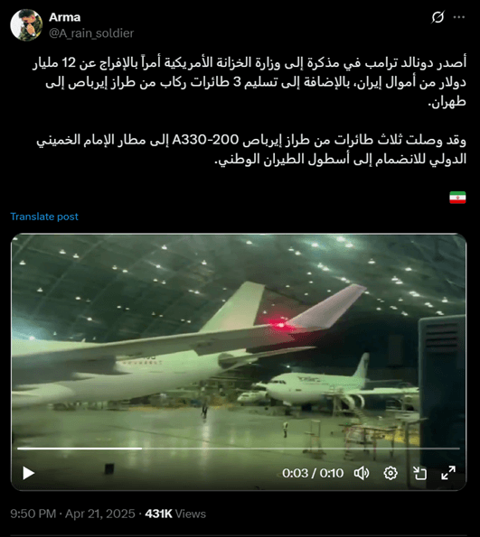خبر تتداوله صفحات وحسابات على مواقع التواصل الاجتماعي، حديثًا، مفاده أن دونالد ترامب أصدر مذكرة إلى وزارة الخزانة الأميركية، يأمر فيها بالإفراج عن 12 مليار دولار من أموال إيران، وتسليمها ثلاث طائرات من طراز إيرباص، كما أُرفق الخبر بفيديو يُظهر ثلاث طائرات.
