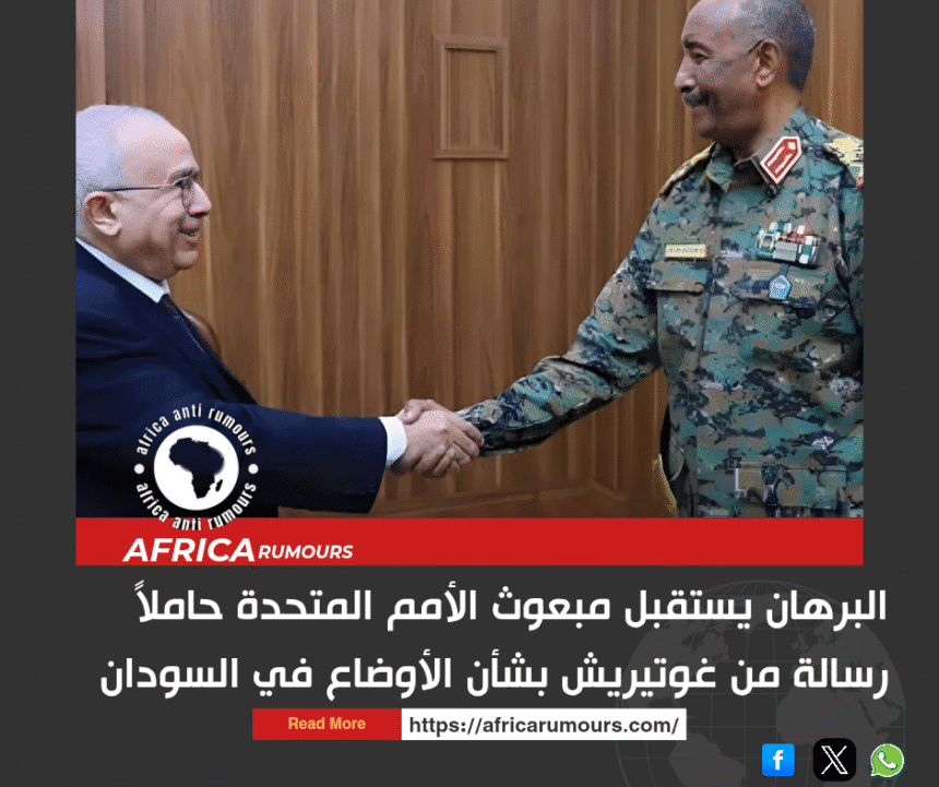إفريقيا لمكافحة الشائعات > الأخبار > اخبار افريقيا > البرهان يستقبل مبعوث الأمم المتحدة حاملاً رسالة من غوتيريش بشأن الأوضاع في السودان