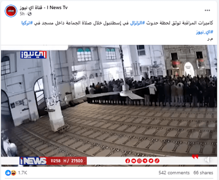 مقطع فيديو متداول حديثًا، ادّعى ناشروه أنه يظهر لحظة وقوع الهزّة الأرضية التي تعرضت لها إسطنبول يوم أمس الأربعاء 23 إبريل/نيسان، في مشهد وثقته كاميرا مراقبة داخل أحد المساجد.