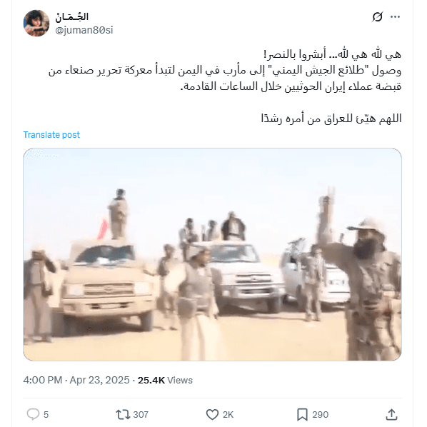 مقطع فيديو متداول عبر حسابات وصفحات على مواقع التواصل الاجتماعي، حديثًا، ادّعى ناشروه أنه يُظهر وصول قوات الجيش اليمني إلى محافظة مأرب في اليمن، استعدادًا لبدء معركة استعادة صنعاء من الحوثيين خلال الساعات المقبلة.