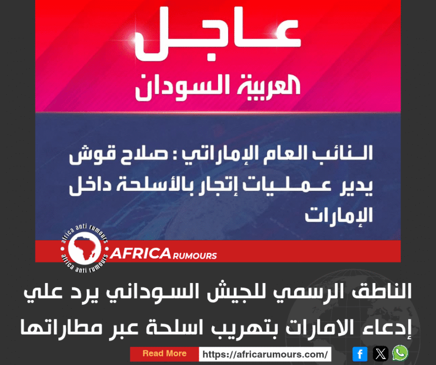 ردا علي ما اوردته مواقع وصحف اماراتية حول إحباط السلطات بالامارات لمحاولة تهريب اسلحة وذخائر للسودان عبر طائرة خاصة للسودان صرح الناطق الرسمي باسم القوات المسلحة السودانية د. نبيل عبدالله لوكالة رويترز قائلا (نحن دولة ذات سيادة وجيش وطني لا نحتاج إلى تهريب السلاح، انما الإمارات هي من تمارس السلوك الاجرامي بتزويد مليشيا آل دقلو المتمردة والارهابية بكل أنواع العتاد من الطلقة وحتى المسيرات الاستراتيجية، وتمول الحرب ضد الشعب السوداني، وهذا ليس اتهاما بل حقائق تسندها أدلة دامغة قدمناها للعالم وذلك من خلال مقبوضاتنا من الأسلحة والذخائر ومختلف انواع العتاد التي ضبطناها واستولينا عليها في مواقع المليشيا.