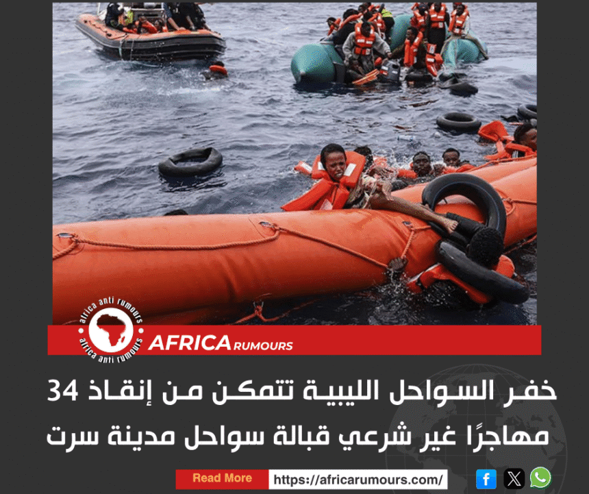 إفريقيا لمكافحة الشائعات > الأخبار > اخبار افريقيا > إنقاذ 34 مهاجرًا غير شرعي قبالة سواحل سرت الليبية ضمن جهود خفر السواحل المستمرة لمكافحة الهجرة غير الشرعية…