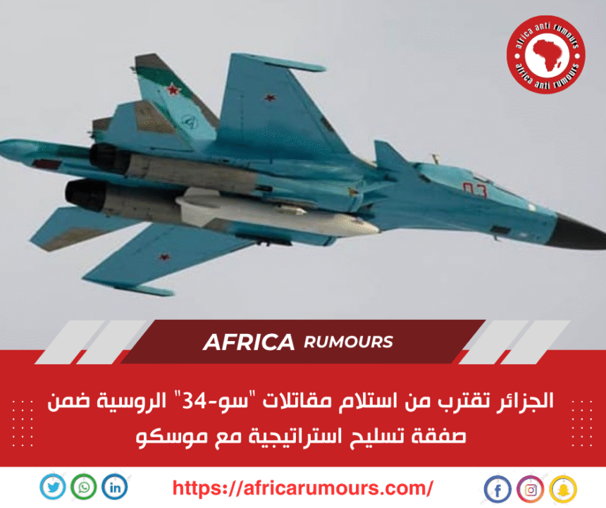 وبحسب تقارير متخصصة، فإن الجزائر كانت قد وقّعت في عام 2019 عقداً لشراء 14 طائرة من طراز “سو-34″، وهي مقاتلات متعددة المهام تعود إلى الحقبة السوفياتية، وتُعرف بقدراتها العالية على تنفيذ ضربات دقيقة في العمق، فضلاً عن قدرتها على التحليق لمسافات طويلة دون الحاجة لمرافقة جوية.