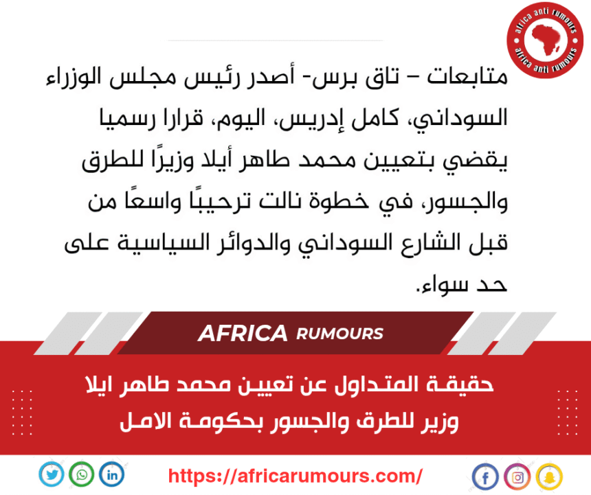 تداولت وسائط إعلامية ومواقع التواصل الاجتماعي خلال الساعات الماضية أنباءً تفيد بتعيين السيد محمد طاهر إيلا وزيرًا للطرق والجسور في الحكومة السودانية. وقد أثار الخبر تفاعلاً واسعًا بين المتابعين، خاصة في ظل غياب تصريحات رسمية تؤكد أو تنفي صحة المعلومة في بداية الأمر.