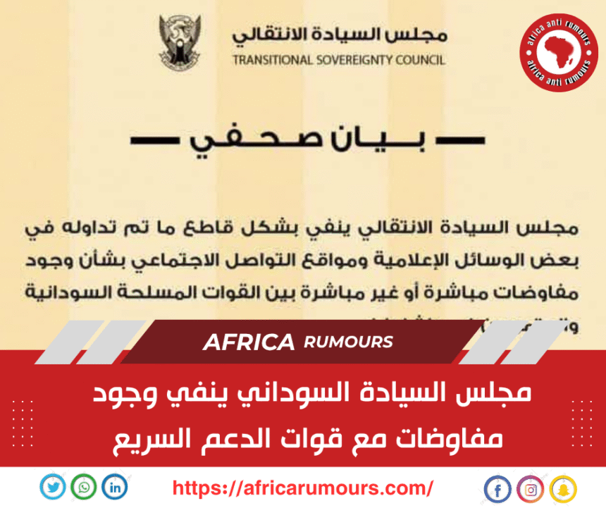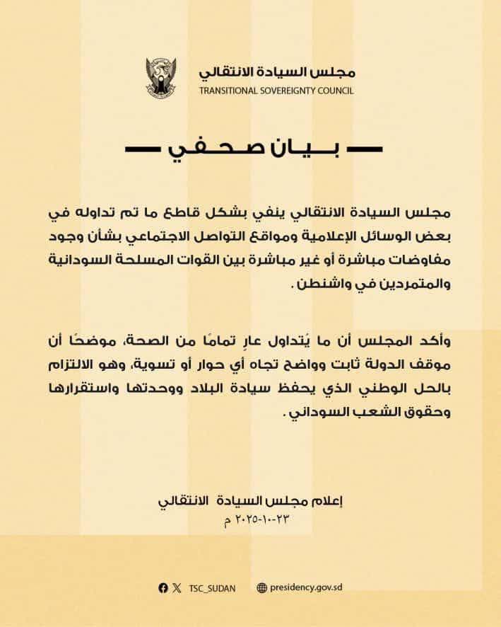 وأكد المجلس أن “ما يُتداول حول هذا الموضوع عارٍ تماماً من الصحة”، مشدداً على أن موقف الدولة السودانية ثابت تجاه أي عملية تفاوض، ويتمثل في الالتزام بالحل الوطني الذي يحفظ سيادة البلاد ووحدتها واستقرارها، ويصون حقوق الشعب السوداني.
